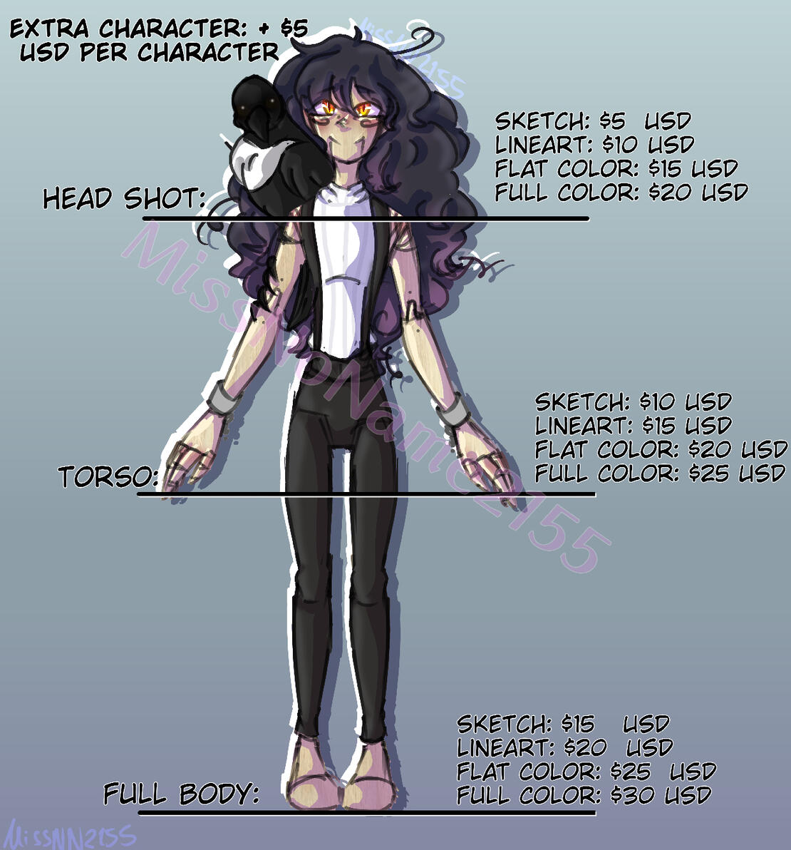 -I require credit in any repost of my work. Do not claim my work as your own.-I retain the copyright to my work, so I may post/display the commissioned piece on my socials, portfolio, etc.-Discuss with me first if you would like to use the said commission for anything other than Personal use-Once you’ve read all of my requirements, fill out the following form of information and send it to me via Twitter DM’s if you wish to commission me:- A commission can take me from a few days to over a month or more. The waiting time will increase based on the amount commissioned and other customers. Check my current slots whenever you want a status update.- If your order becomes delayed, I will inform you ASAP.- If you need your commission to be made by a certain date you must state it in the information form. An extra fee may be charged due to giving your commission priority.